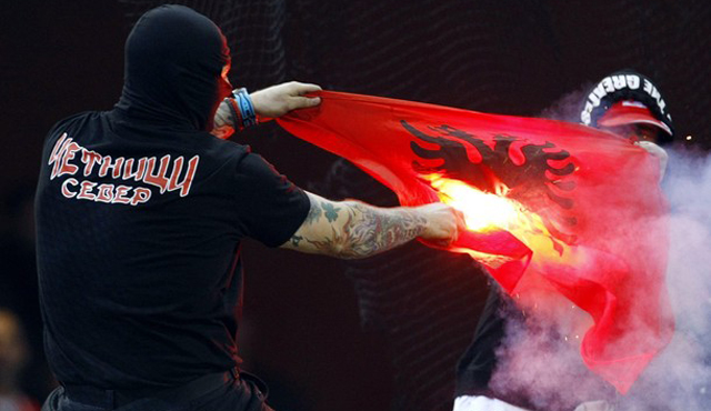 Huliganët serbë djegin flamurin shqiptar