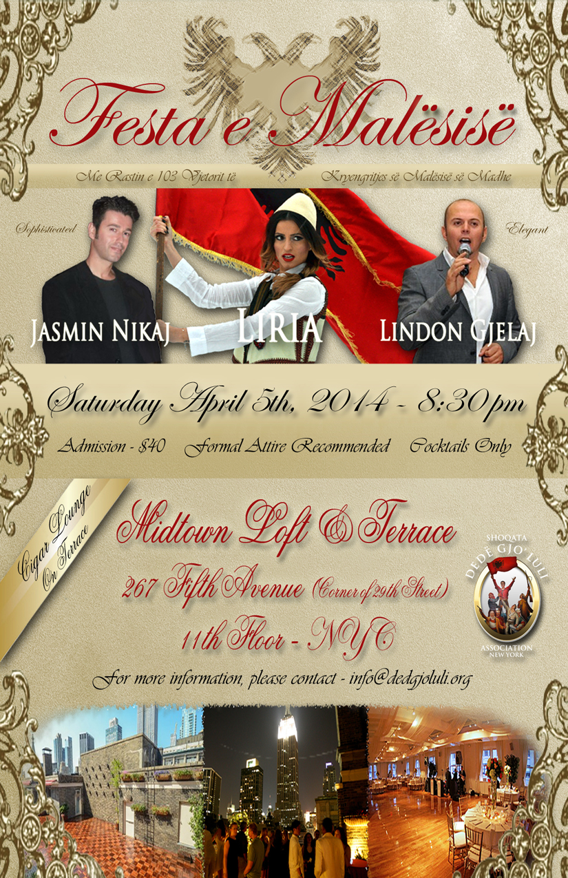FestaeMalesiseFlyerPrint8.5x5.5Me rastin e 103 vjetorit të Kryengritjes së Malësisë, “Shoqata Dedë Gjon Luli” – New York, me datën 5 prill organizon mbrëmjen Festa e Malësisë.