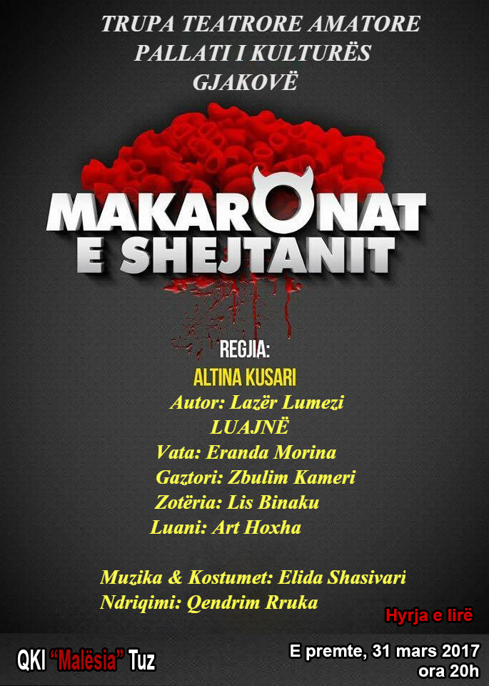 Të premten me 31. Mars 2017 në ora 20:00 në Qendrën kulturo-informative „Malësia” në Tuz do të shfaqet komedia për të rinj “Makaronat e shejtanit” e autorit Lazer Lumezi, interpretuar nga Trupa teatrale amatore e Pallatit të kulturës -Gjakovë.