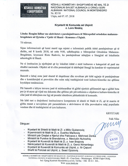 Me rastin e vizitës së paralajmëruar të Amfilohijes Radoviq në lokalitetin arkeologjik të Shasit (komuna e Ulqinit), Këshilli Kombëtar i Shqiptarëve i është drejtuar organeve kompetente të Malit të Zi. Shkresa i është drejtuar: