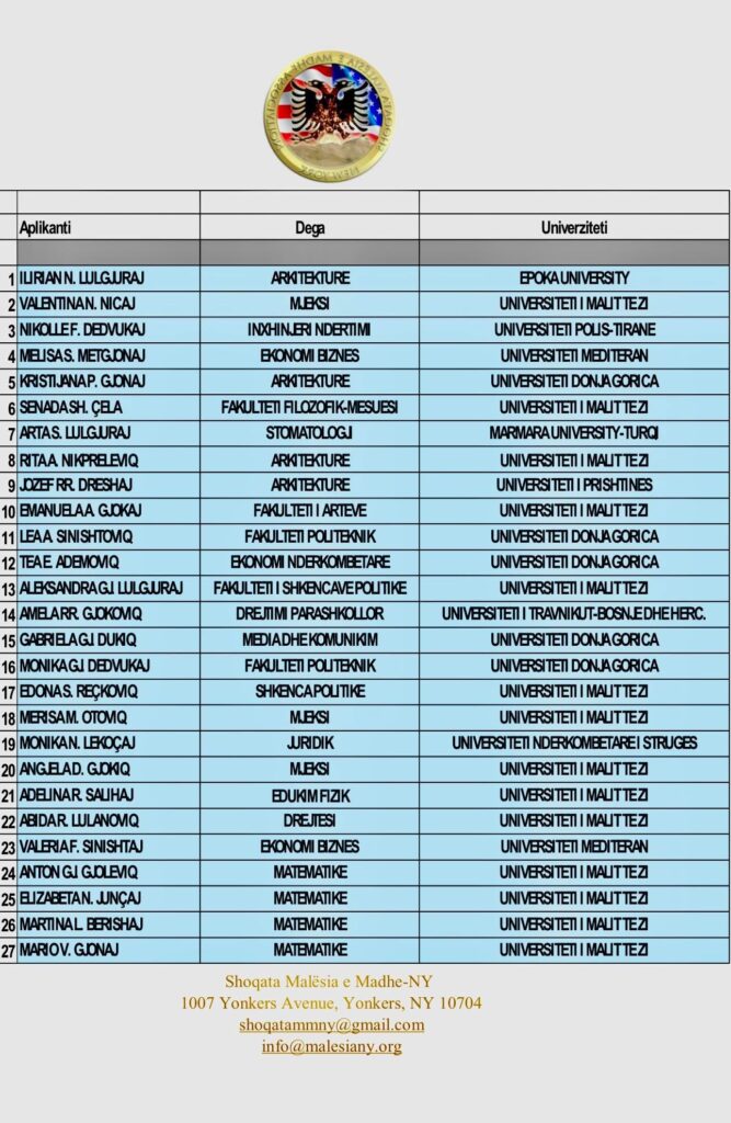 Shoqata “Malësia e Madhe” – New York ka shpallur përfituesit e bursave për vitin akademik 2025–2026, duke vazhduar traditën shumëdekadëshe të mbështetjes së studentëve nga Malësia.