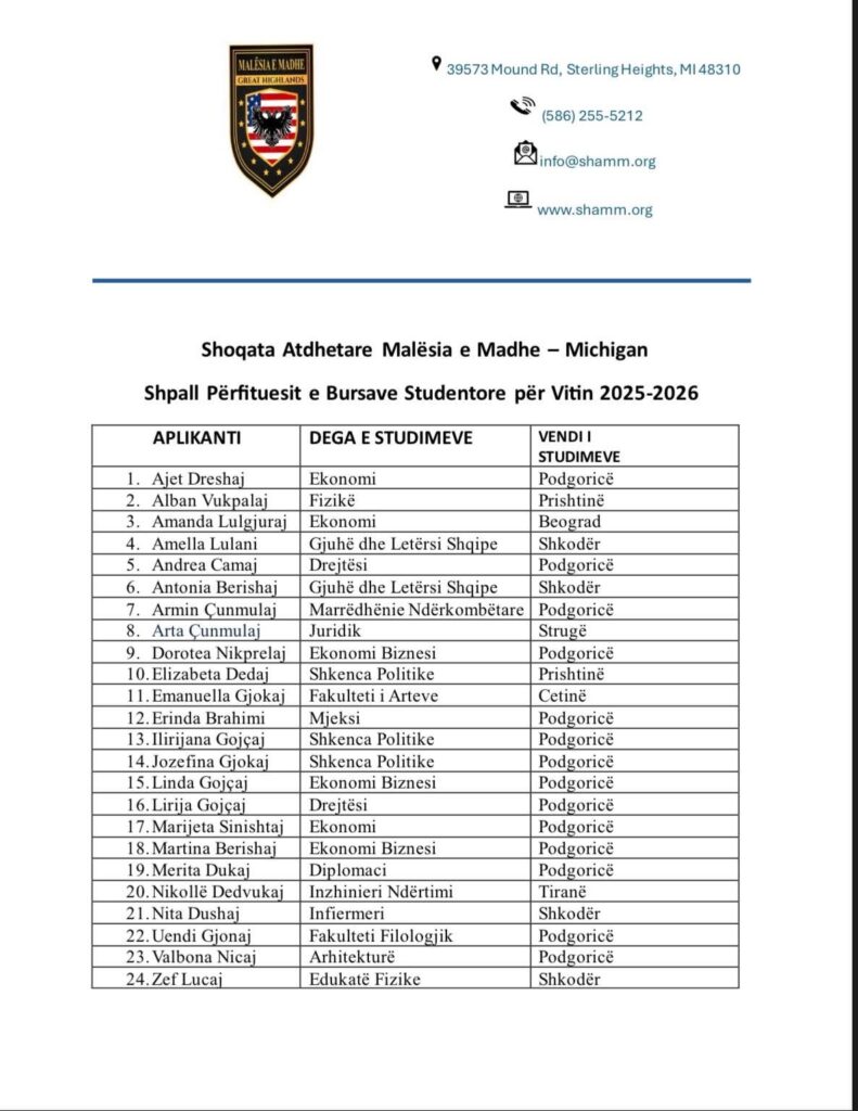 Shoqata Atdhetare “Malësia e Madhe” në Michigan ka ndarë gjithsej 23 bursa studentore për studentët nga Malësia për vitin shkollor 2025/2026, me një fond të përgjithshëm prej 17,600 dollarësh.